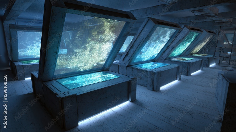 The watermark will not be included on Wall mural.: Crystal growth rates and environmental conditions are displayed on multiple screens in a high tech c