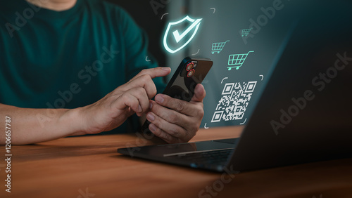 The watermark will not be included on Wall mural.: Customers pay via mobile phone and scan qr code to shopping online - the concept of using smartphone