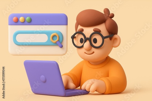 Wall mural cute 3d character wearing glasses working on a laptop computer with a floating search bar interface  - Wall murals Wall mural cute 3d character wearing glasses working on a laptop computer with a floating search bar interface - Wall murals