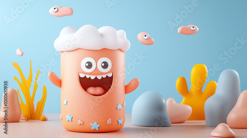 The watermark will not be included on Wall mural.: Cute and colorful cartoon character with a happy expression, surrounded by abstract shapes and sea p