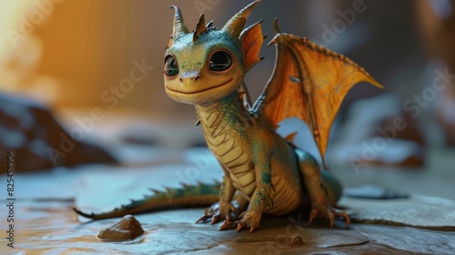 Wall mural : Cute baby dragon stand resting with its wings folded in a foggy forest -