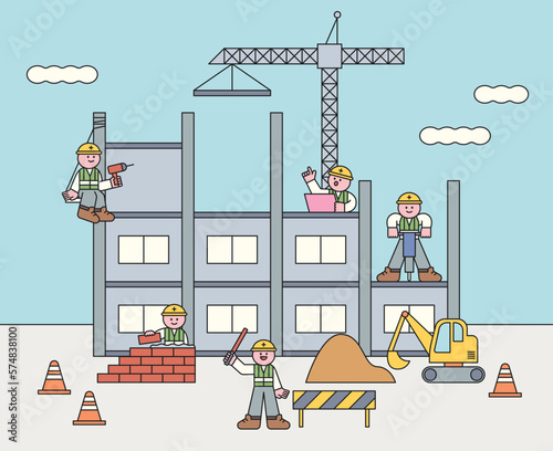 The watermark will not be included on Wall mural.: Cute characters are building - they are laying bricks and using a drill - a worker is holding a light