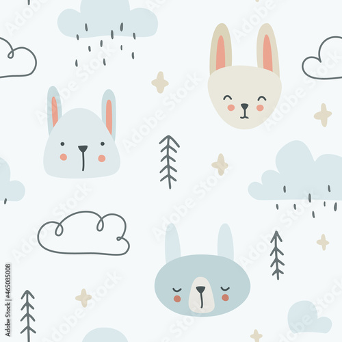 Wall mural : Cute doodle scandinavian bunny pattern with forest tree and rain clouds - seamless texture for textil