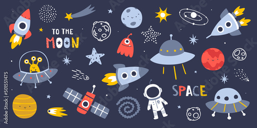 Wall mural cute outer space set. cosmic bundle with doodle spaceships and planet. collection of naive stellar s