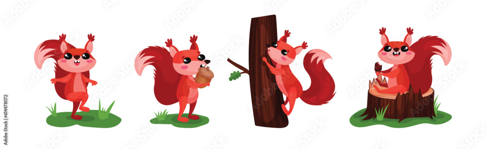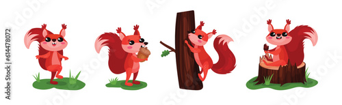The watermark will not be included on Wall mural.: Cute red squirrel character with bushy tail engaged in different activity vector set