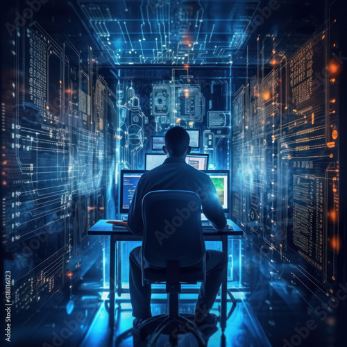 Wall mural : Cutting-edge vision: tech guru in futuristic data center utilizing laptop amidst warehouse, streamli