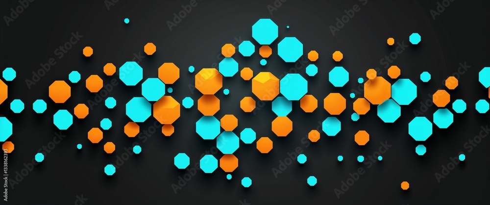 The watermark will not be included on Wall mural.: Cyan to orange random geometric shapes pattern glowing on plain black dark background abstract illus