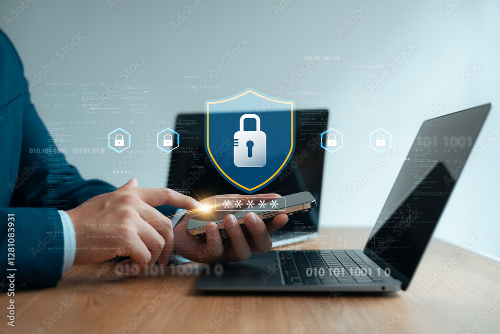 The watermark will not be included on Wall mural.: Cyber ​​network security and data protection on the internet, businessman using security encryption