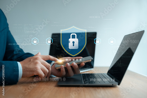 Wall mural cyber ​​network security and data protection on the internet, businessman using security encryption  - Wall murals Wall mural cyber ​​network security and data protection on the internet, businessman using security encryption - Wall murals
