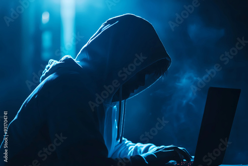 Wall mural : Cyber hacker attack concept - abstract digital hacker man with a laptop - male criminal, hoodie and re