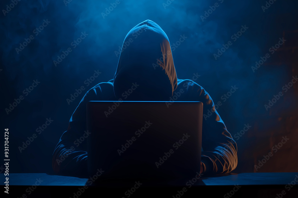 Wall mural cyber hacker attack concept. abstract digital hacker man with a laptop. male criminal, hoodie and re - Wall murals Wall mural cyber hacker attack concept. abstract digital hacker man with a laptop. male criminal, hoodie and re - Wall murals