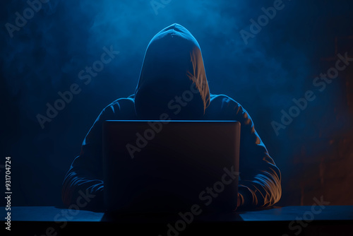 Wall mural : Cyber hacker attack concept - abstract digital hacker man with a laptop - male criminal, hoodie and re