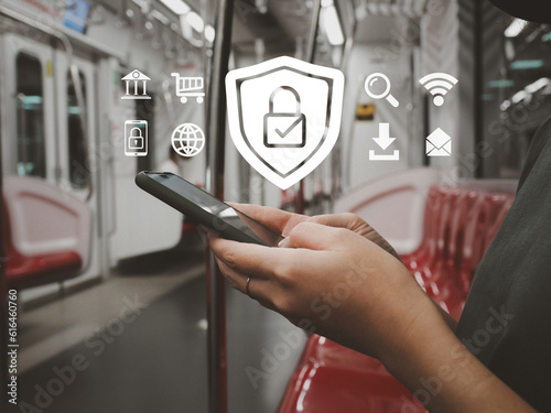 The watermark will not be included on Wall mural.: Cyber security, businessman using smartphone security to protect business data through a secure inte