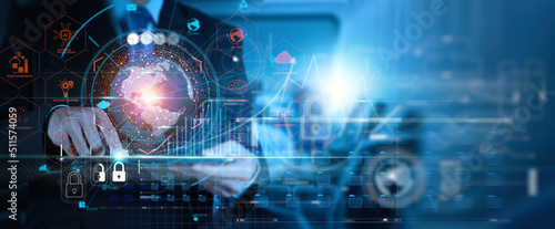 Wall mural cyber security and data protection business intelligence, businessman and digital tablet global netw - Wall murals Wall mural cyber security and data protection business intelligence, businessman and digital tablet global netw - Wall murals