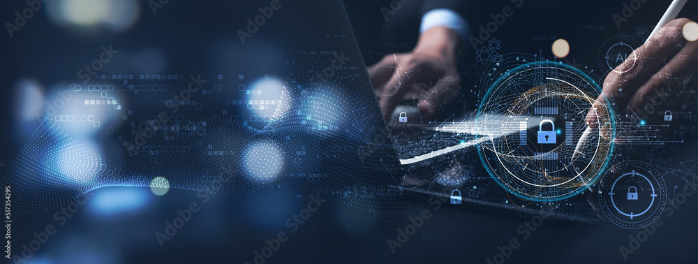 Wall mural cyber security and data protection. businessman using digital tablet protecting business and financi - Wall murals Wall mural cyber security and data protection. businessman using digital tablet protecting business and financi - Wall murals