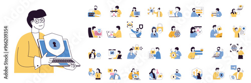 Wall mural : Cyber security concept mega set with character scenes in flat design for web - bundle situations with
