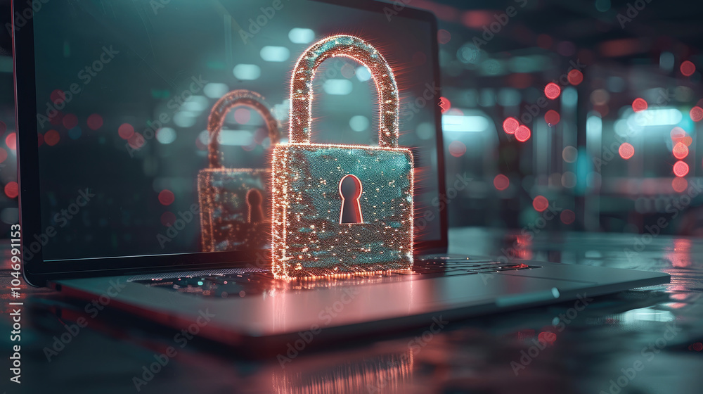 Wall mural cyber security concept of a digital padlock in front of a laptop computer, digital security. - Wall murals Wall mural cyber security concept of a digital padlock in front of a laptop computer, digital security. - Wall murals