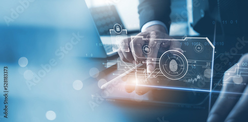 Wall mural cyber security concept. businessman using digital tablet and fingerprint scanning unlock and access  - Wall murals Wall mural cyber security concept. businessman using digital tablet and fingerprint scanning unlock and access - Wall murals