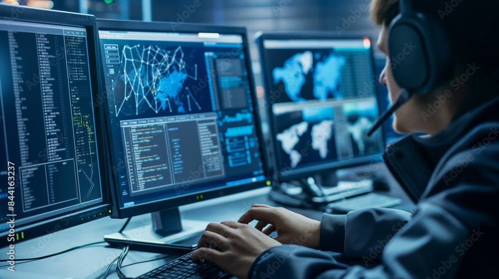 The watermark will not be included on Wall mural.: Cyber security expert working on computer