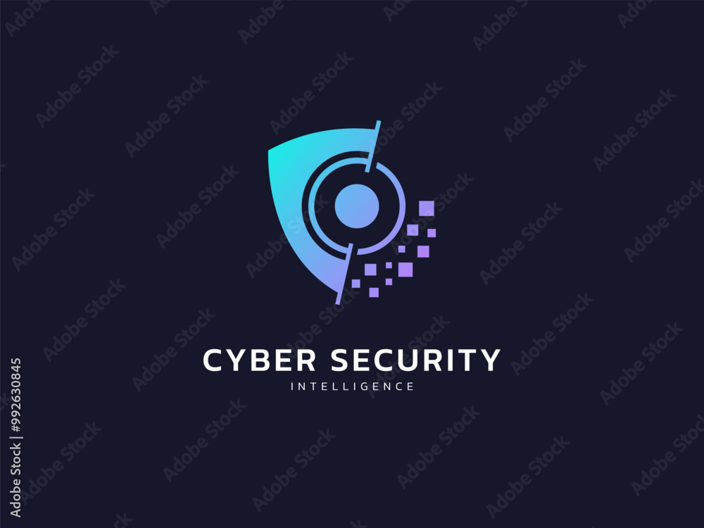 The watermark will not be included on Wall mural.: Cyber security intelligence data protection shield with robot eye scan and analysis technology logo