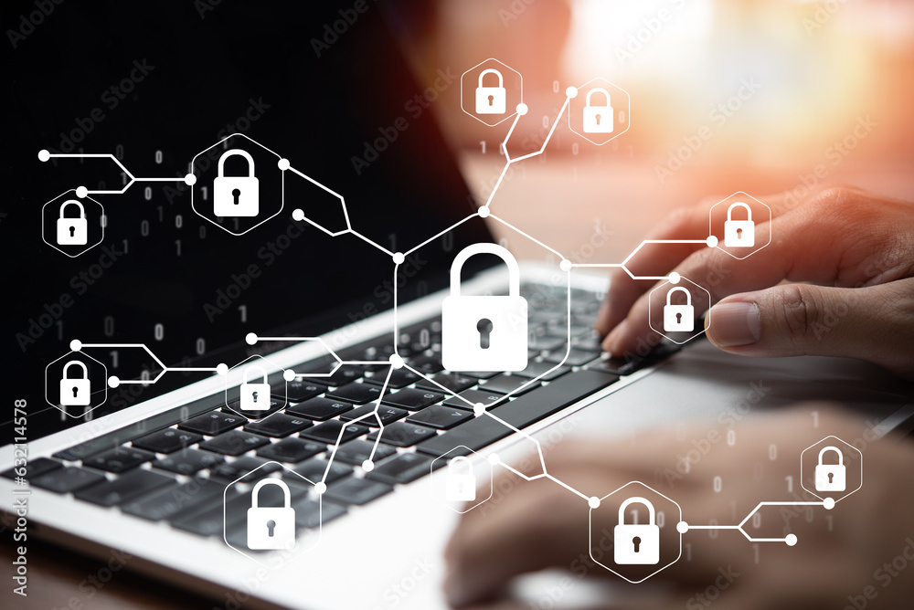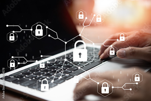 Wall mural cyber security system protects data information safe storage networks. businessman using laptop inte - Wall murals Wall mural cyber security system protects data information safe storage networks. businessman using laptop inte - Wall murals