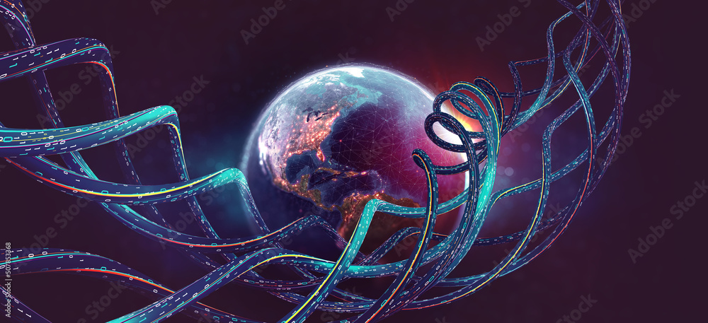 Wall mural : Cyber space of outer orbits - information flows of the digital universe - 3d illustration of a planet