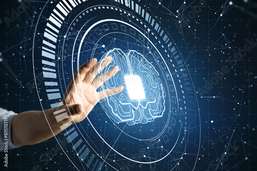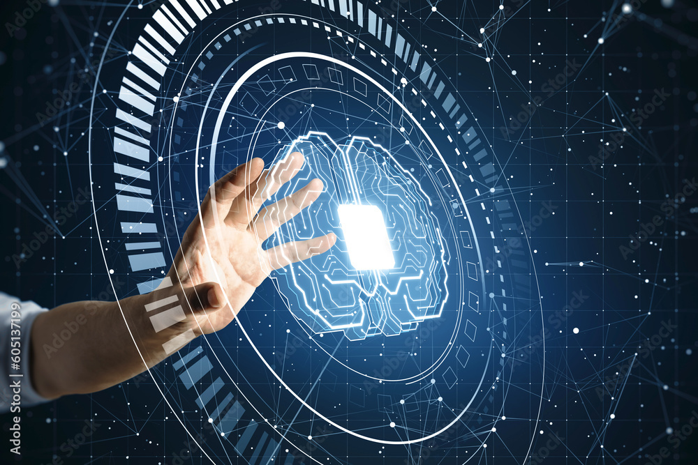 Wall mural cyber technology, artificial intelligence and machine learning concept with man hand touching digita - Wall murals Wall mural cyber technology, artificial intelligence and machine learning concept with man hand touching digita - Wall murals