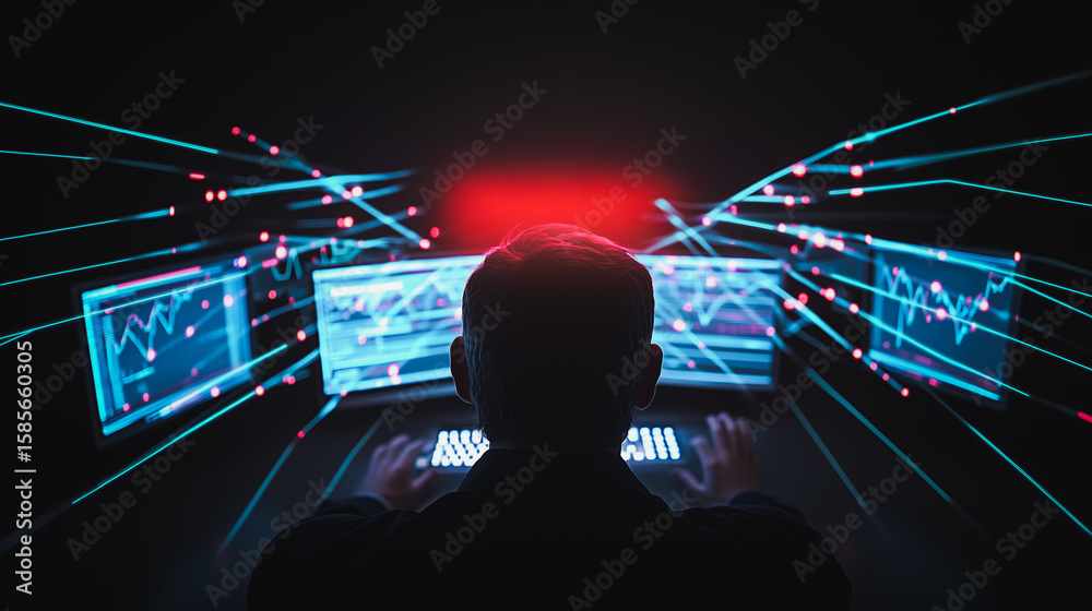 Wall mural cyber trader at night: a silhouette of a trader intensely focused on multiple screens displaying dyn - Wall murals Wall mural cyber trader at night: a silhouette of a trader intensely focused on multiple screens displaying dyn - Wall murals
