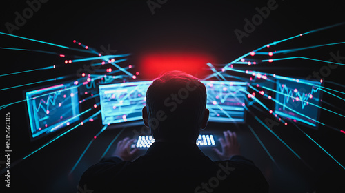 The watermark will not be included on Wall mural.: Cyber trader at night: a silhouette of a trader intensely focused on multiple screens displaying dyn