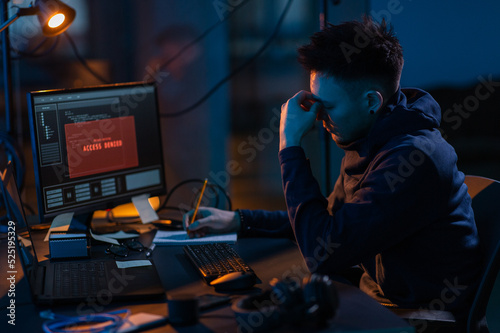 Wall mural cybercrime, hacking and technology concept - male hacker in dark room writing to notebook and using
