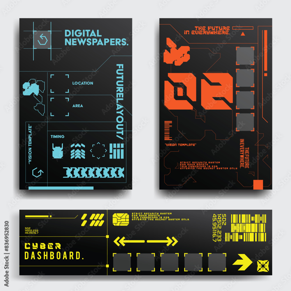 The watermark will not be included on Wall mural.: Cyberpunk scifi gaming futuristic icon pattern hud ux ui set collection template, 2d illustration re