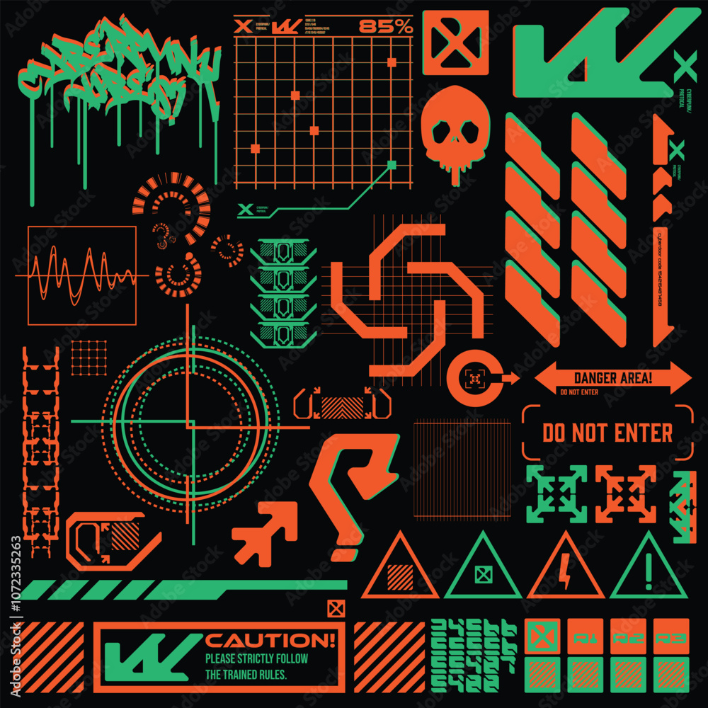 Cyberpunk scifi gaming futuristic icon pattern hud ux ui set collection template, 2d illustration reWall mural
