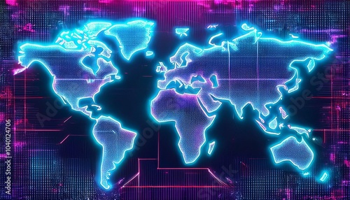 Wall mural : Cyberpunk themed world map with neon lines glitch effects and a digital grid pattern background