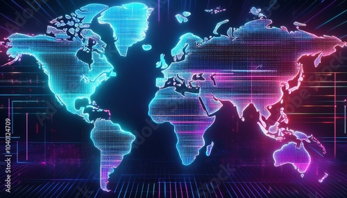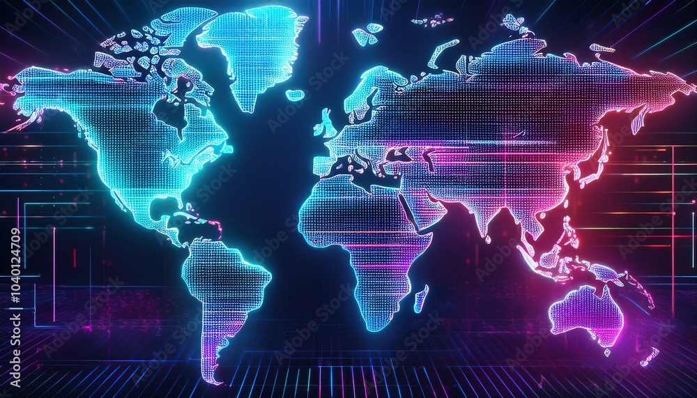 Wall mural : Cyberpunk themed world map with neon lines glitch effects and a digital grid pattern background