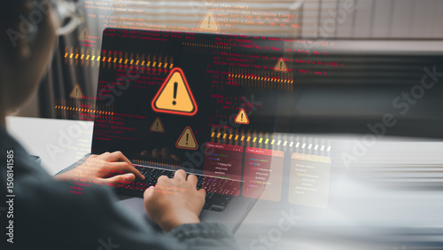 Wall mural : Cybersecurity alert concept showing hacker threat or malware warning with red exclamation icons and