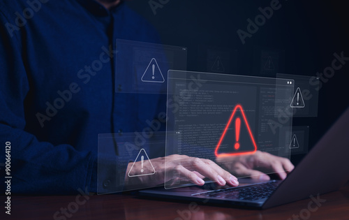 Wall mural cybersecurity alert concept. person using laptop with multiple warning symbols displayed, indicating - Wall murals Wall mural cybersecurity alert concept. person using laptop with multiple warning symbols displayed, indicating - Wall murals