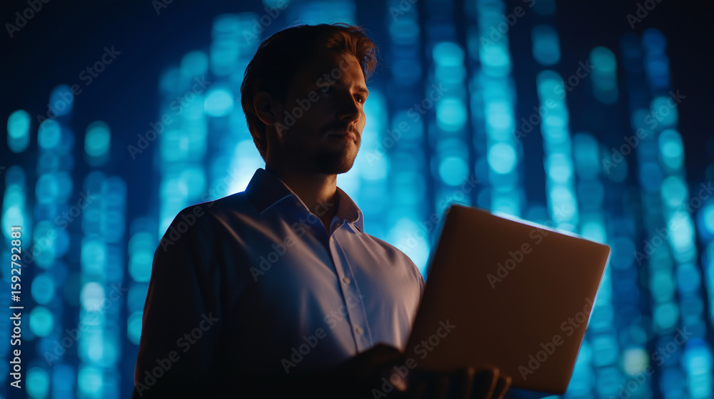 The watermark will not be included on Wall mural.: Cybersecurity analyst in front of dark screens with code