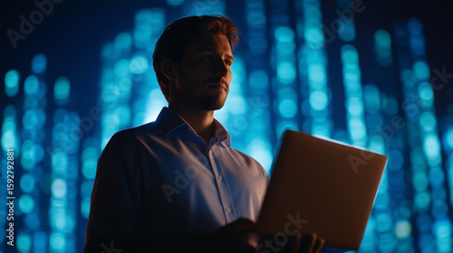 Wall mural : Cybersecurity analyst in front of dark screens with code