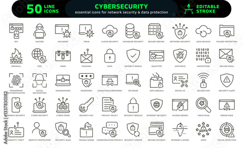 Cybersecurity and data protection icon set - thin line editable stroke icons for network security, prWall mural