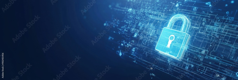 Wall mural cybersecurity banner background with a digital padlock and tech icons on a blue color for an online  - Wall murals Wall mural cybersecurity banner background with a digital padlock and tech icons on a blue color for an online - Wall murals