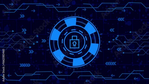 The watermark will not be included on Wall mural.: Cybersecurity concept with lock icon in center of circle surrounded by circuit board patterns, symbo