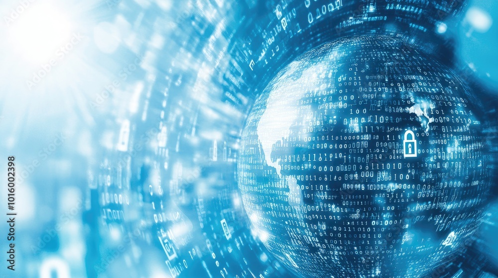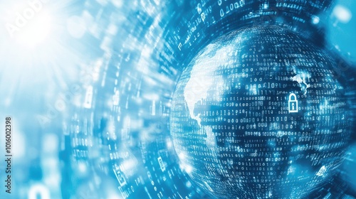 Wall mural cybersecurity lock icons surrounding a globe on a binary code background. copy space in the sky. - Wall murals Wall mural cybersecurity lock icons surrounding a globe on a binary code background. copy space in the sky. - Wall murals