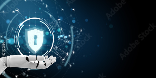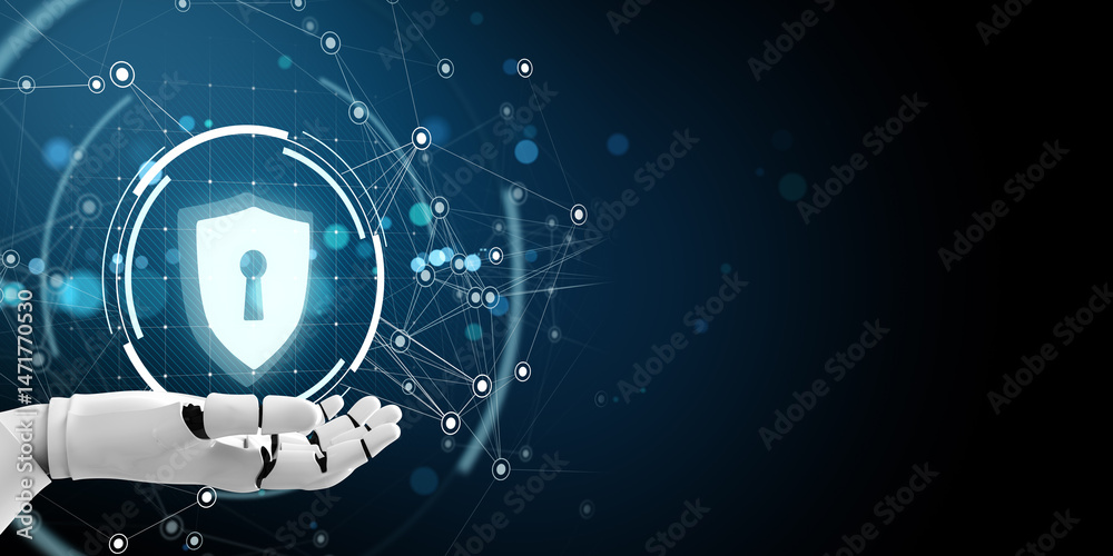 Wall mural cybersecurity shield with keyhole floating above robotic hand on futuristic digital network backgrou