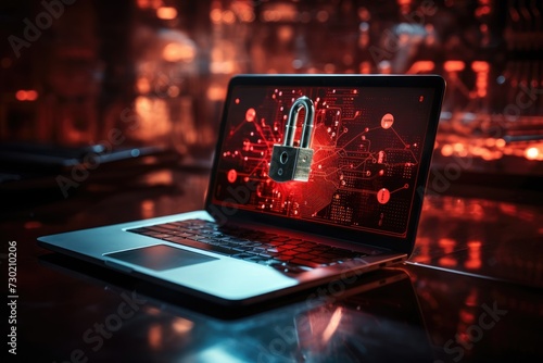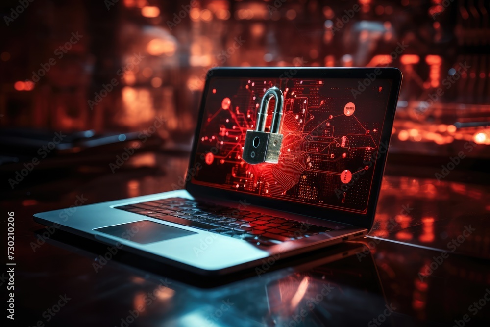 Wall mural cybersecurity. lock on a desk displaying on laptop. cyber attack on computer network, virus, spyware