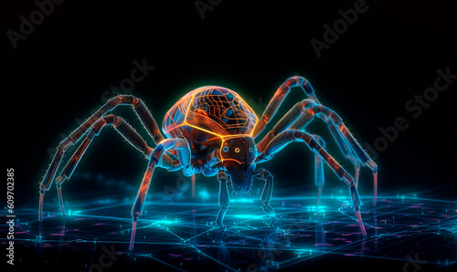Wall mural cyberspider on digital glowing web background. purple 3d techno insect with yellow force field creat