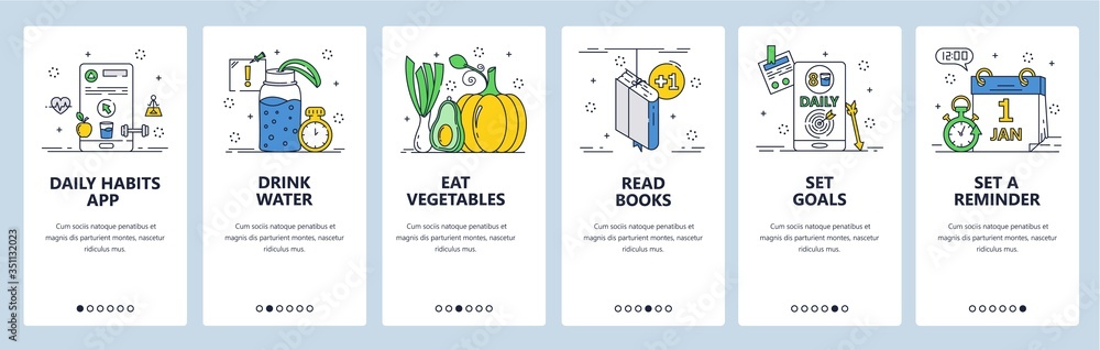 The watermark will not be included on Wall mural.: Daily habits website and mobile app onboarding screens vector template