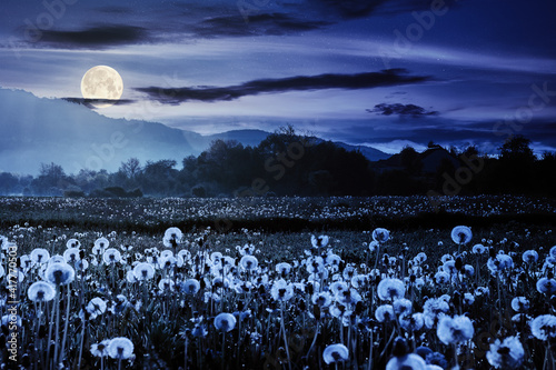 Dandelion field in rural landscape at night - beautiful nature scenery with blooming weeds in full moWall mural