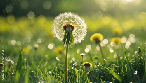 Wall mural : Dandelion seed head glowing in soft light with blurred green background in springtime meadow
