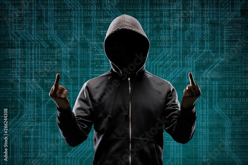 Wall mural dangerous hacker over abstract digital background with binary code. obscured dark face in mask and h - Wall murals Wall mural dangerous hacker over abstract digital background with binary code. obscured dark face in mask and h - Wall murals