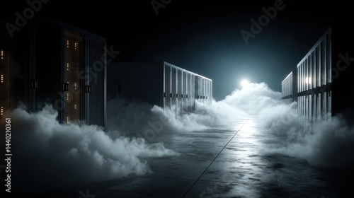 The watermark will not be included on Wall mural.: Dark, moody scene of server racks in a data center, surrounded by swirling fog, illuminated by a bri